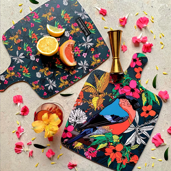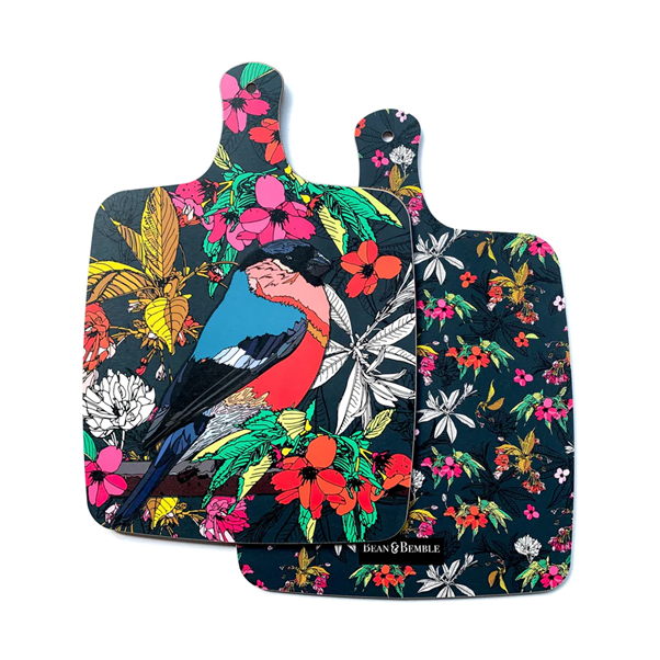 Mince, chop, and dice on the Bean & Bemble Cherry Blossom Bullfinch Large Chopping Board! This handcrafted melamine board is designed in the UK, and it's made from sustainable eucalyptus wood. Plus, its printed design is twice the fun--featuring different patterns on the front and back. And, it can take the heat--up to 160°C! Chop chop to get your Cherry Blossom Bullfinch Board today!